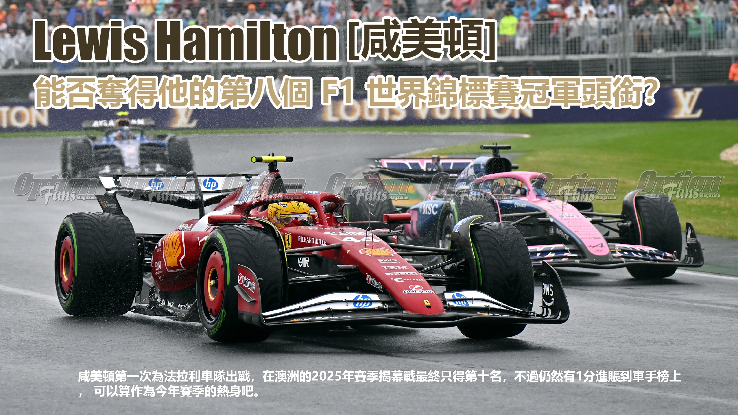 F1澳州一級方程式格蘭披治大獎賽 (Formula 1 Australian Grand Prix) 於3月14-16日在墨爾本 (Melbourne) 的阿爾伯特公園(Albert Park)成功舉行了,經過了五年新冠疫情的影響下,今年再次成功爭取成為本賽季的揭幕戰。本屆大獎賽的正式名稱是 “一級方程式賽車路易威登澳洲大獎賽”。是自併入世界錦標賽後的第87屆澳洲大獎賽,並且是墨爾本第28次舉辦F1賽事。沒想到法國奢侈品品牌路易威登 (Louis Vuitton 或簡單地稱呼為LV) 取代了過往9年的冠名贊助商勞力士 (Rolex), 成為今年首場F1大獎賽的冠名贊助商,相信LV也投資了不少的資金。這次的比賽可謂是一場充滿戲劇性和意外的大混戰:雨水攪局、安全車多次出動、新秀驚艷、老將失誤,幾乎包含了所有讓車迷熱血沸騰的元素。以下就讓我們重溫一下今場精彩的比賽吧。