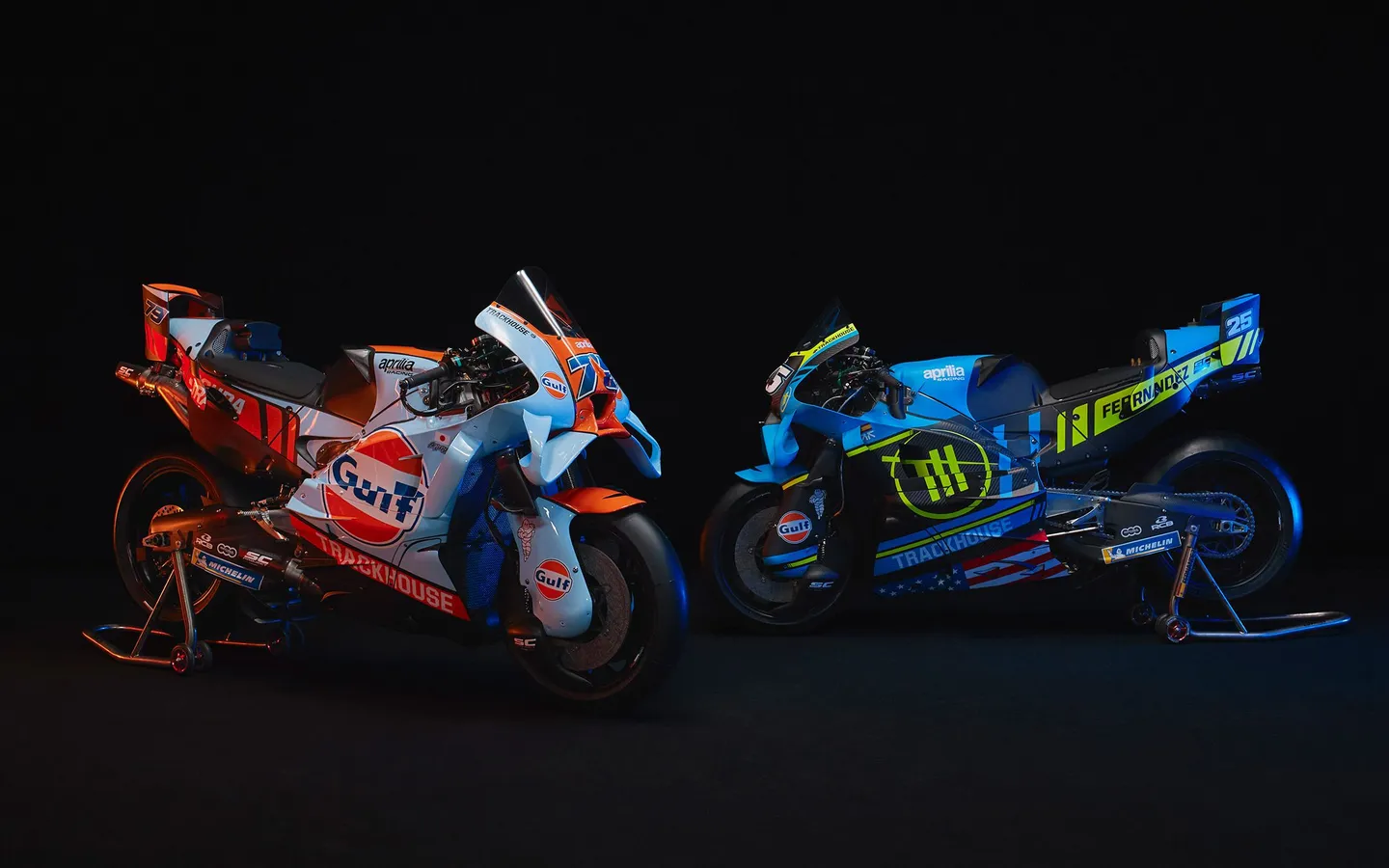 Trackhouse MotoGP Team,Aprilia嘅客戶車隊,屬於一支獨立車隊,中意發掘年輕有潛力嘅車手;小椋藍搭檔Raul Fernandez車手陣容照舊。小椋藍作為圍場唯一嘅日本車手GP第二年表現值得期待,加上Aprilia賽車並不缺乏競爭力領獎台可期。咦,點解兩架車唔同樣嘅?無錯,經典嘅海灣石油Gulf塗裝將會出現喺26賽季其中嘅5站比賽當中。