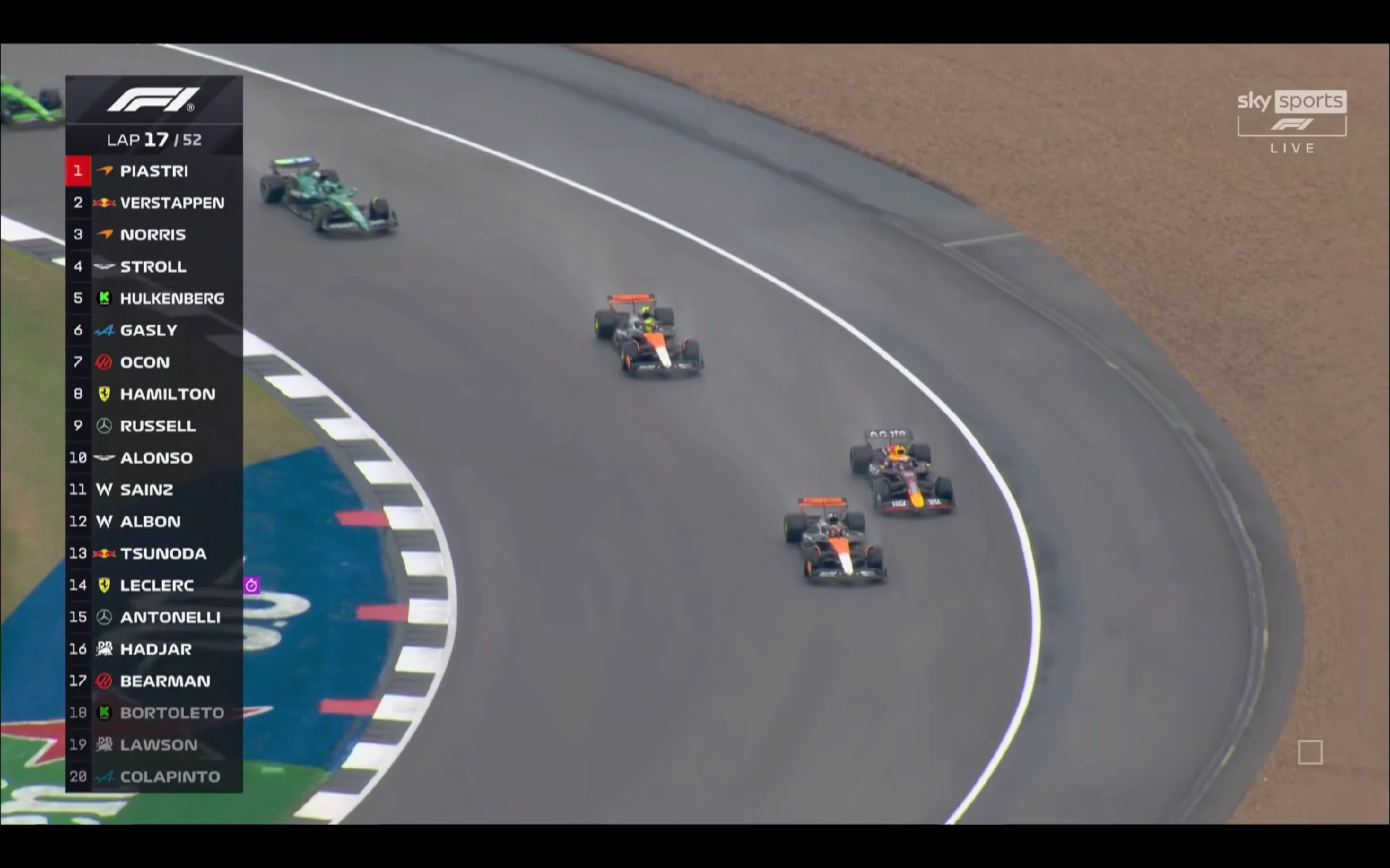 FORMULA 1 HEINEKEN DUTCH GRAND PRIX 2025 – QUALIFYING 29 – 31 Aug 2025 POS. NO. DRIVER TEAM Q1 Q2 Q3 LAPS 1 81 Oscar Piastri McLaren 01:09.3 01:09.0 01:08.7 18 2 4 Lando Norris McLaren 01:09.5 01:08.9 01:08.7 18 3 1 Max Verstappen Red Bull Racing 01:09.7 01:09.1 01:08.9 18 4 6 Isack Hadjar Racing Bulls 01:10.0 01:09.4 01:09.2 18 5 63 George Russell Mercedes 01:09.7 01:09.3 01:09.3 18 6 16 Charles Leclerc Ferrari 01:09.9 01:09.3 01:09.3 22 7 44 Lewis Hamilton Ferrari 01:09.9 01:09.3 01:09.4 21 8 30 Liam Lawson Racing Bulls 01:09.8 01:09.4 01:09.5 18 9 55 Carlos Sainz Williams 01:10.0 01:09.5 01:09.5 18 10 14 Fernando Alonso Aston Martin 01:10.0 01:09.4 01:09.6 17 11 12 Kimi Antonelli Mercedes 01:09.8 01:09.5 12 12 22 Yuki Tsunoda Red Bull Racing 01:10.0 01:09.6 15 13 5 Gabriel Bortoleto Kick Sauber 01:10.0 01:09.6 12 14 10 Pierre Gasly Alpine 01:09.9 01:09.6 15 15 23 Alexander Albon Williams 01:09.8 01:09.7 12 16 43 Franco Colapinto Alpine 01:10.1 9 17 27 Nico Hulkenberg Kick Sauber 01:10.2 9 18 31 Esteban Ocon Haas 01:10.2 9 19 87 Oliver Bearman Haas 01:10.3 9 NC 18 Lance Stroll Aston Martin DNF 2